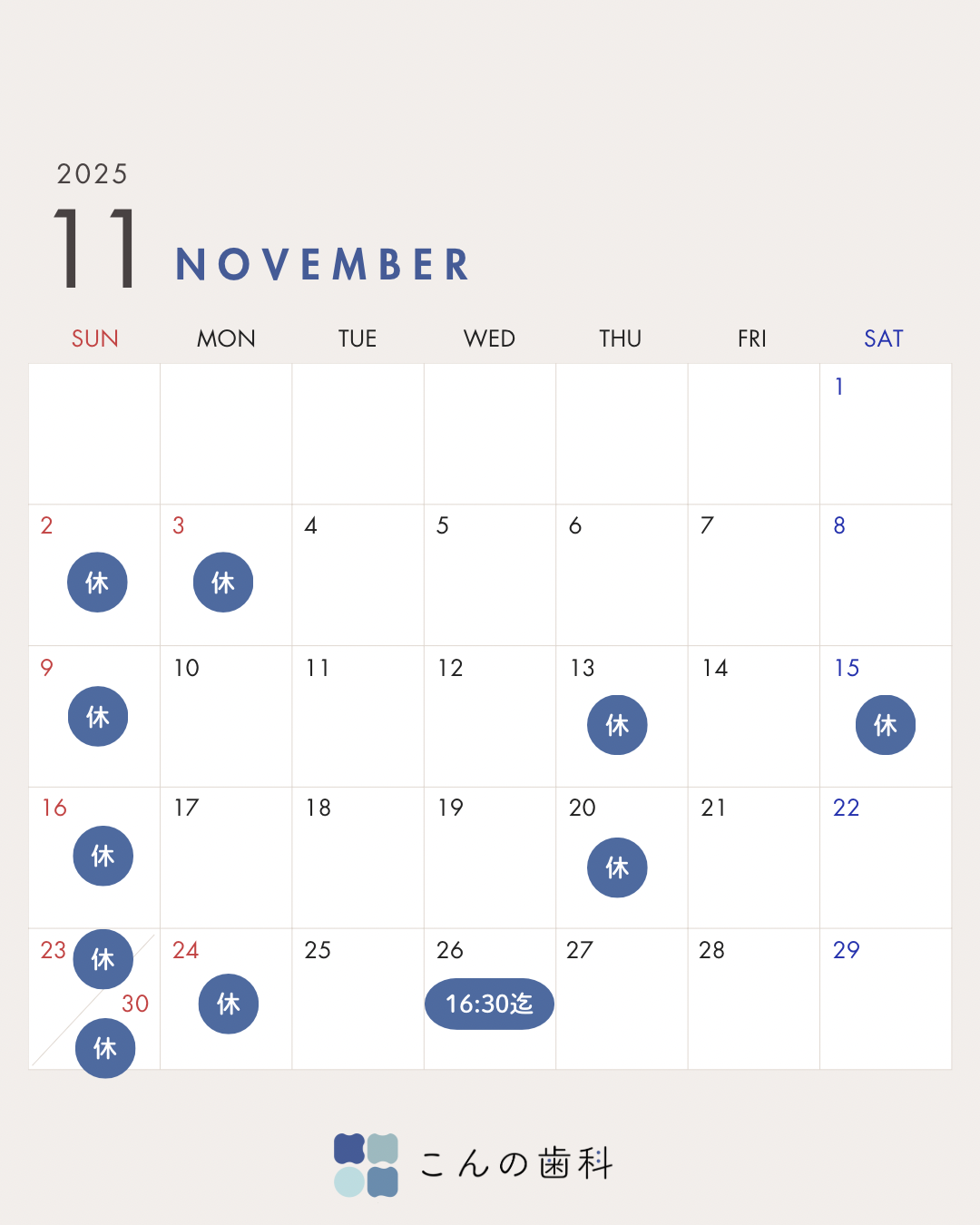 11月の診療について 投稿公開日:2025年10月28日 投稿カテゴリー:お知らせ 11月のカレンダーです🐿️ 11/15(土)は休診、11/26(水)は16:30までの診療となります。 ご予約はホームページまたはお電話にてお気軽にどうぞ🪥 その他の記事を読む 前の投稿10月の診療について