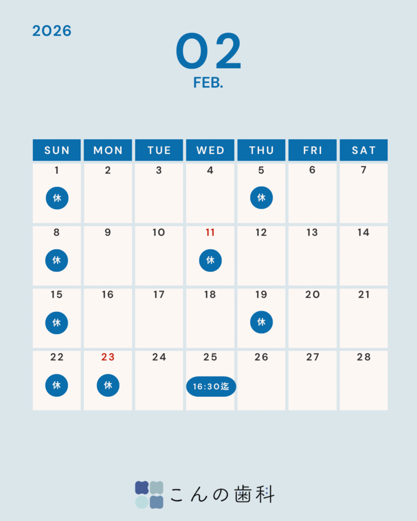 2月の診療について 投稿公開日:2026年1月27日 投稿カテゴリー:お知らせ 2月のカレンダーです☃️ 2/25(水)は16:30までの診療となります。 ご予約はホームページまたはお電話にてお気軽にどうぞ🪥 ☎︎:022-253-6244 その他の記事を読む 前の投稿1月の診療について