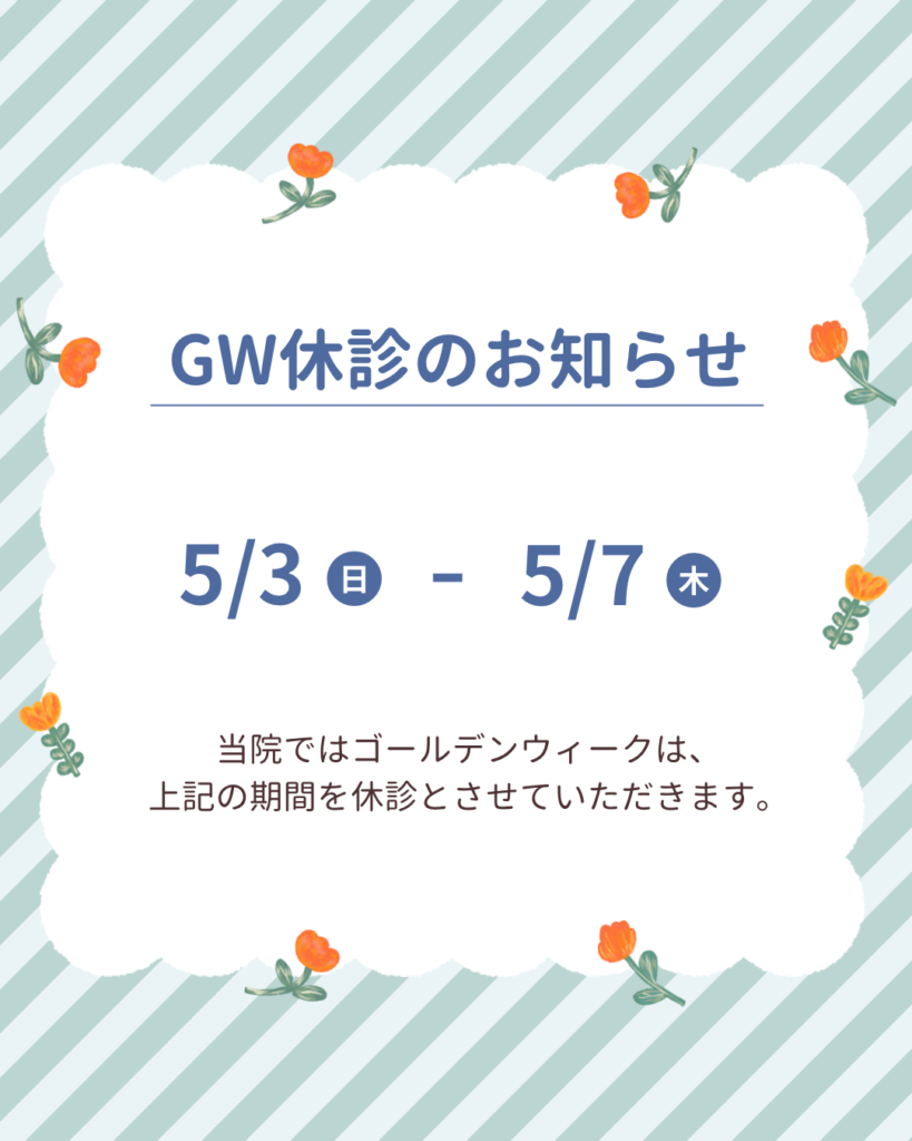ゴールデンウィークの休診日について 投稿公開日:2026年4月23日 投稿カテゴリー:お知らせ ゴールデンウィーク期間休診のお知らせです📣 5/3(日)から5/7(木)まで休診とさせていただきます。 なお、休診の期間もWeb予約は受け付けております。 プロフィール欄のリンクよりアクセスできますのでぜひご利用ください🪥 その他の記事を読む 前の投稿5月の診療について
